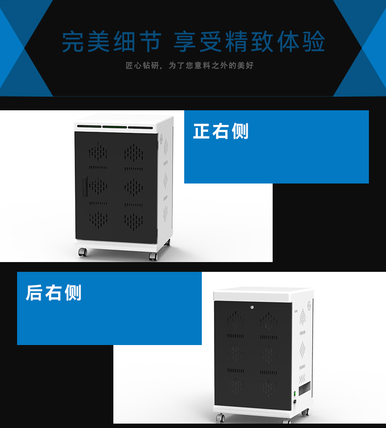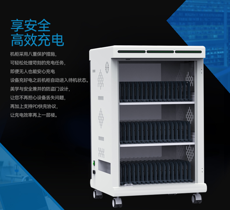 4.隱藏式把手設(shè)計(jì):將整個(gè)頂部設(shè)計(jì)成隱藏式把手結(jié)構(gòu),無(wú)需安裝外置把手,推動(dòng)便捷。★ 5.前門(mén)最大旋轉(zhuǎn)角度270°,在使用者操作時(shí),盡量少占用使用場(chǎng)景空間,方便拿取,同時(shí)該設(shè)計(jì)有效降低門(mén)的故障率?!铩铩?nbsp; 6.前門(mén)采用三點(diǎn)式平面鎖,防盜性能超過(guò)常規(guī)鎖。★ 7.充電狀態(tài)顯示:配備抬頭LED指示燈面板(采用PC材質(zhì),顯示清晰,美觀(guān)耐用),對(duì)每一臺(tái)電腦的充電狀態(tài)進(jìn)行全面監(jiān)測(cè),充電中顯示紅燈,充滿(mǎn)顯示綠燈?!铩铩?nbsp;