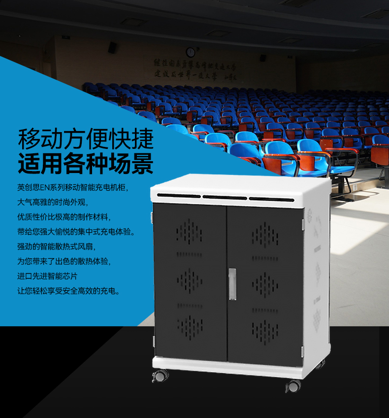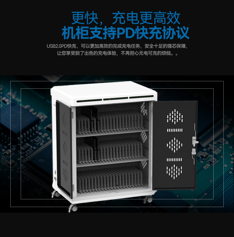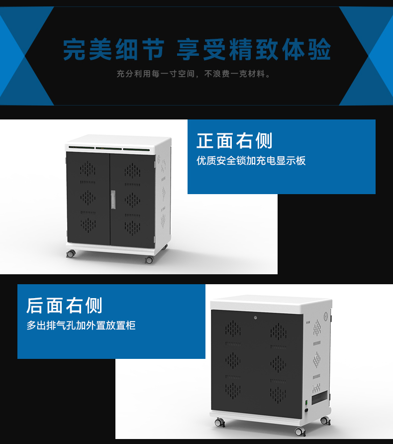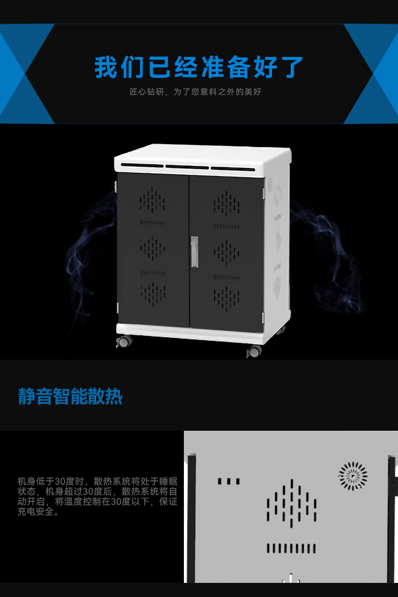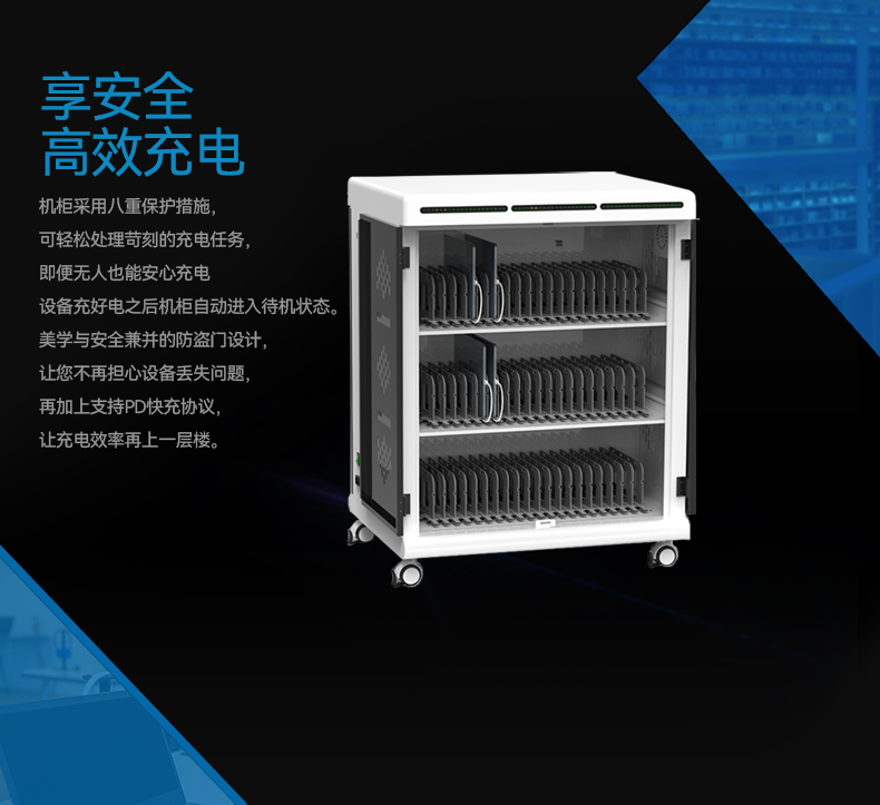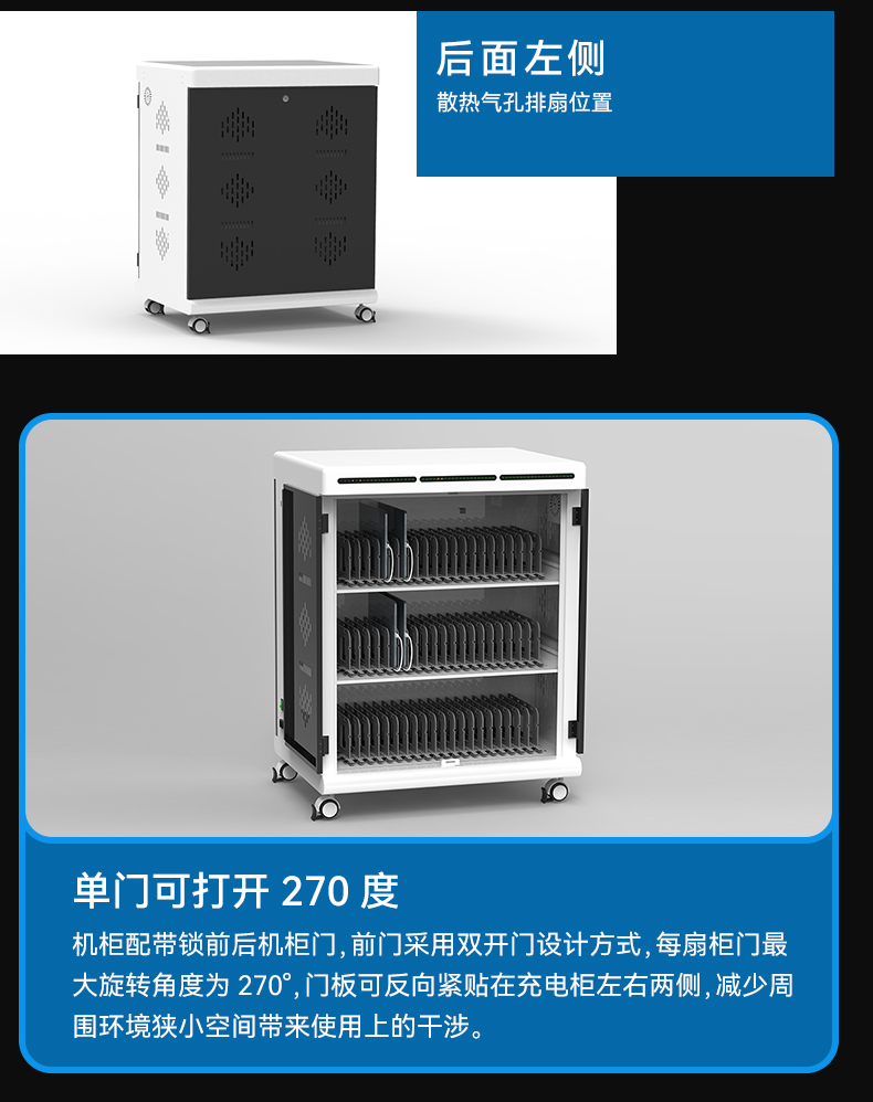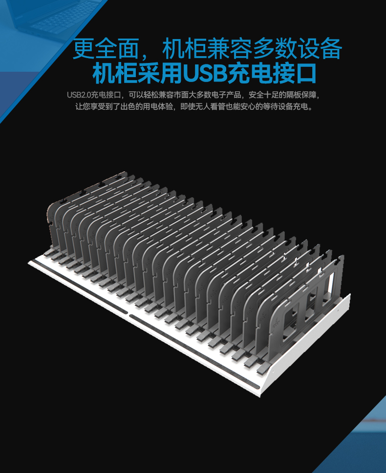 2.擺放整齊:配備多功能防火ABS隔板,充電線可隱藏排布,和平板電腦(筆電)互不交集,伸縮自如,整齊美觀。